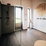 To ensure a comfortable stay, amenities such as an air conditioner, along with a fireplace, are offered to guests. Within the in-room media amenities, there is a flat-screen TV with satellite channels. A bathroom includes a separate toilet and a shower, as well as dressing gowns and towels.